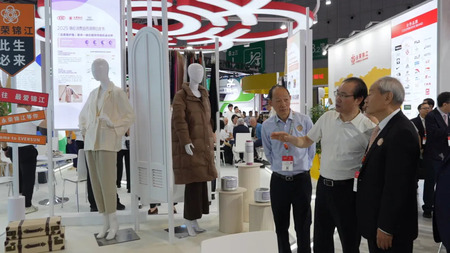 汪建根向中国纺织工业联合会原会长杜钰洲介绍企业创新产品