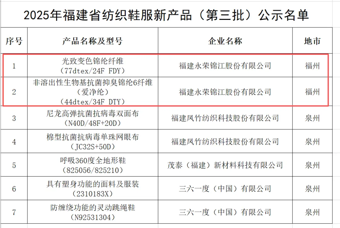 近日,福建省工信厅正式发布2025年福建省纺织鞋服新产品(第三批)名单,福建永荣锦江股份有限公司(以下简称“永荣股份”)自主研发的非溶出性生物基抗菌抑臭锦纶6纤维“爱净纶”(44dtex/34F DTY)与光致变色锦纶纤维(77dtex/24F FDY)凭借其创新技术与应用潜力双双成功入选。