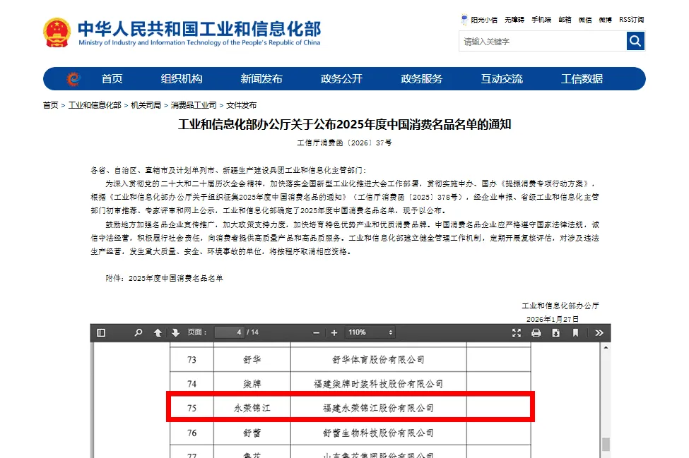 近日,工业和信息化部正式对外公布了2025年度中国消费名品名单,福建永荣锦江股份有限公司(以下简称“永荣股份”)凭借旗下“永荣锦江”品牌脱颖而出,成功入选这一极具含金量的榜单,成为行业焦点。