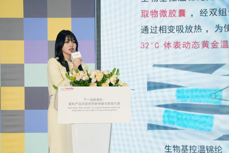 生物基控温锦纶,将天然棕榈果提取物微胶囊“内嵌”于锦纶纤维之中,通过相变材料的固液转换,自主吸放热,帮助人体维持在28至32摄氏度的黄金体感温度。该产品兼具抗菌性能与柔软触感,实现了动态控温、健康防护与极致舒适的多元融合。