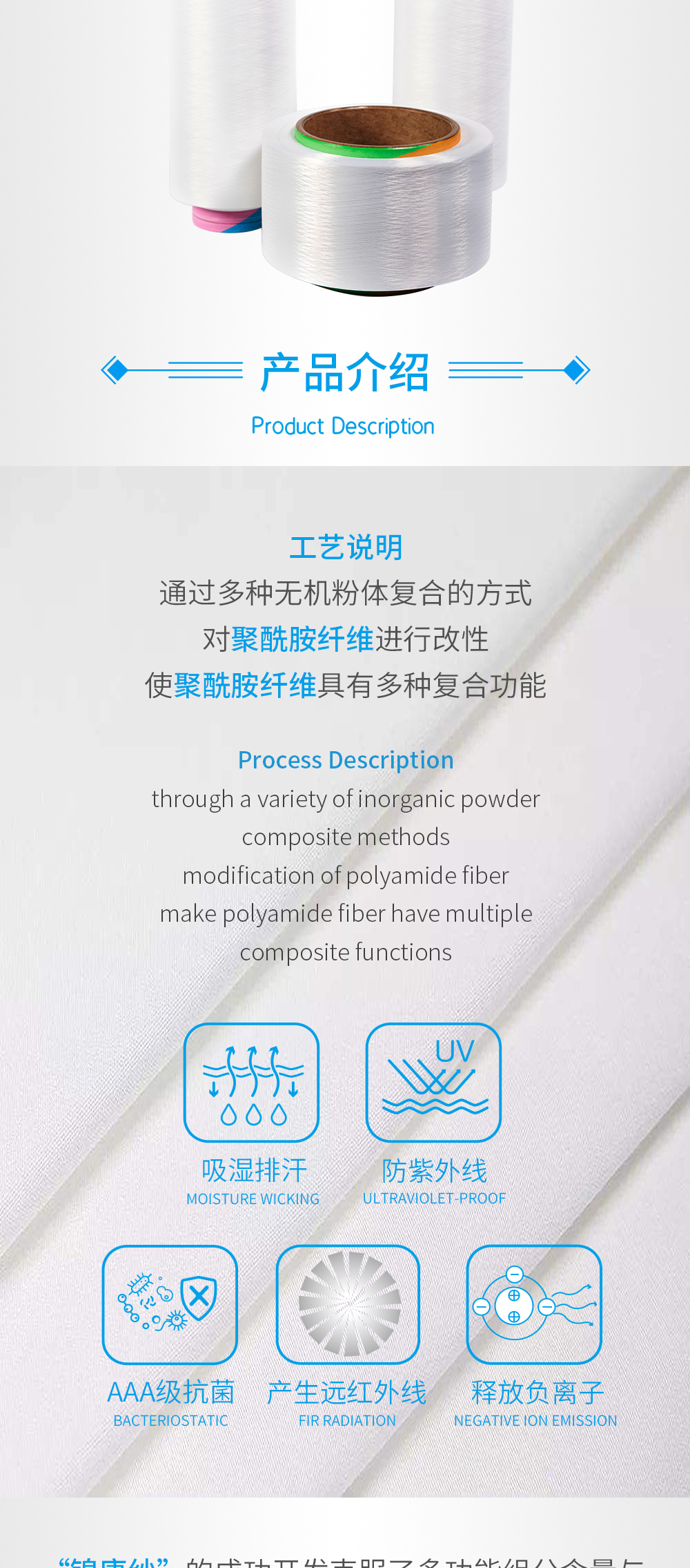 通过多种无机粉体复合的方式对聚酰胺纤维进行改性,使聚酰胺纤维具有抗菌、消臭、远红外、负离子发射、防紫外,导湿透气多种复合功能。