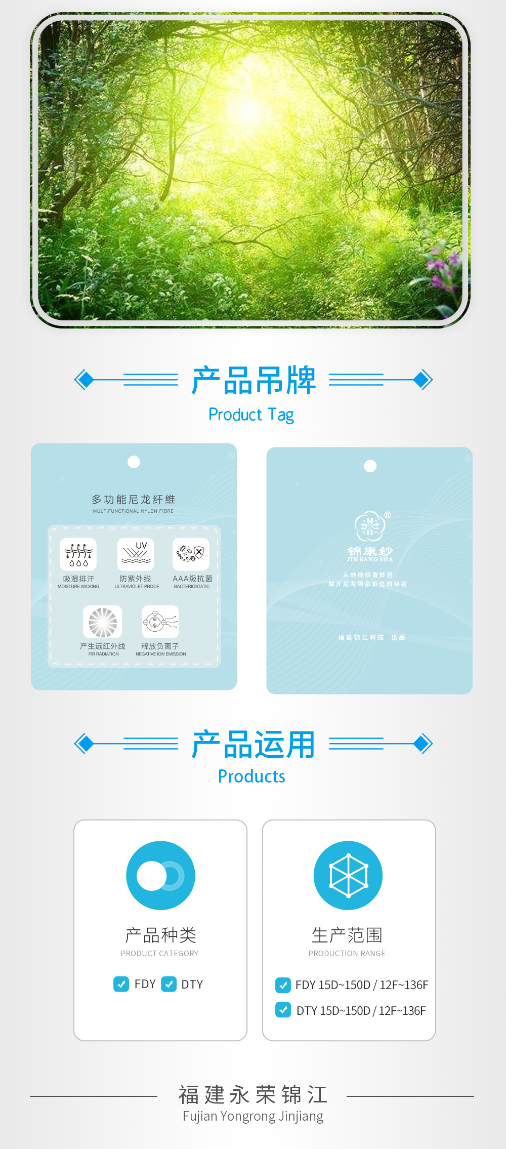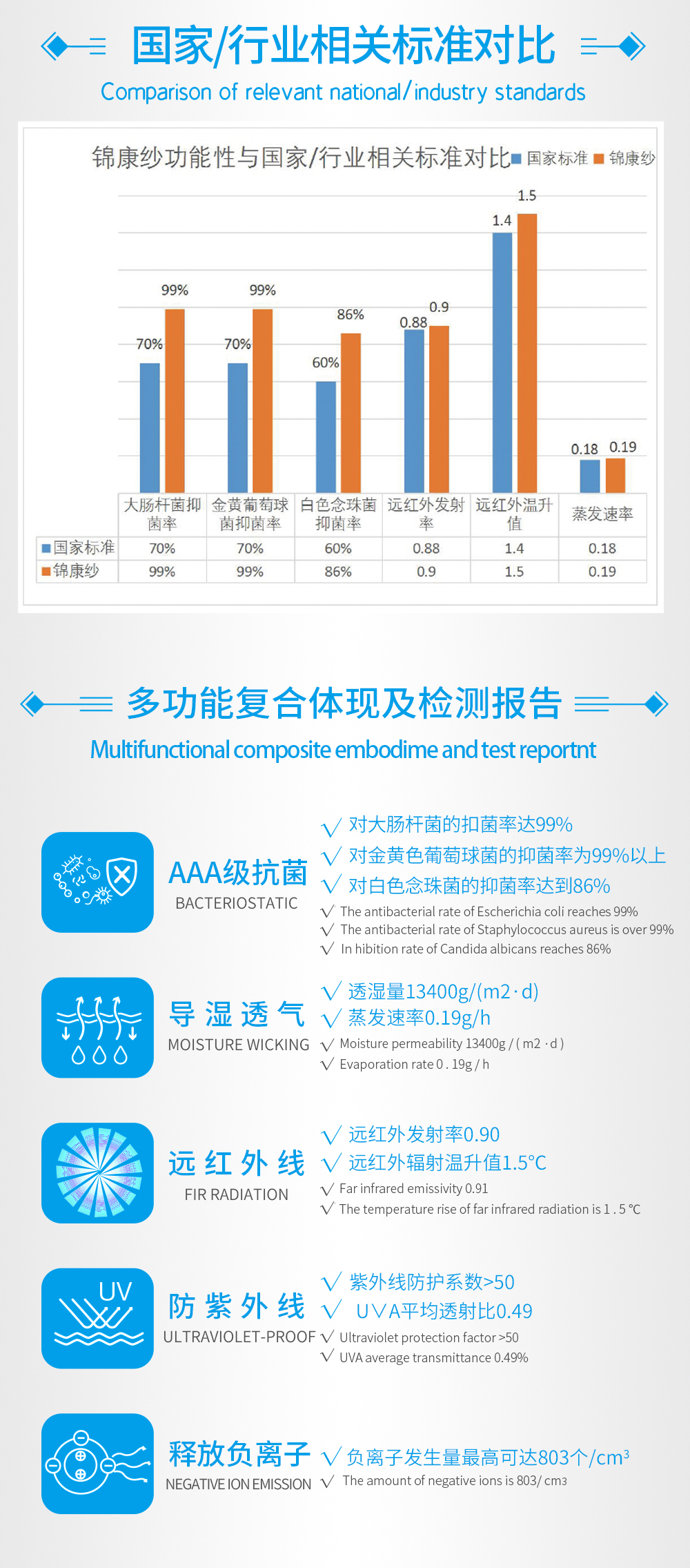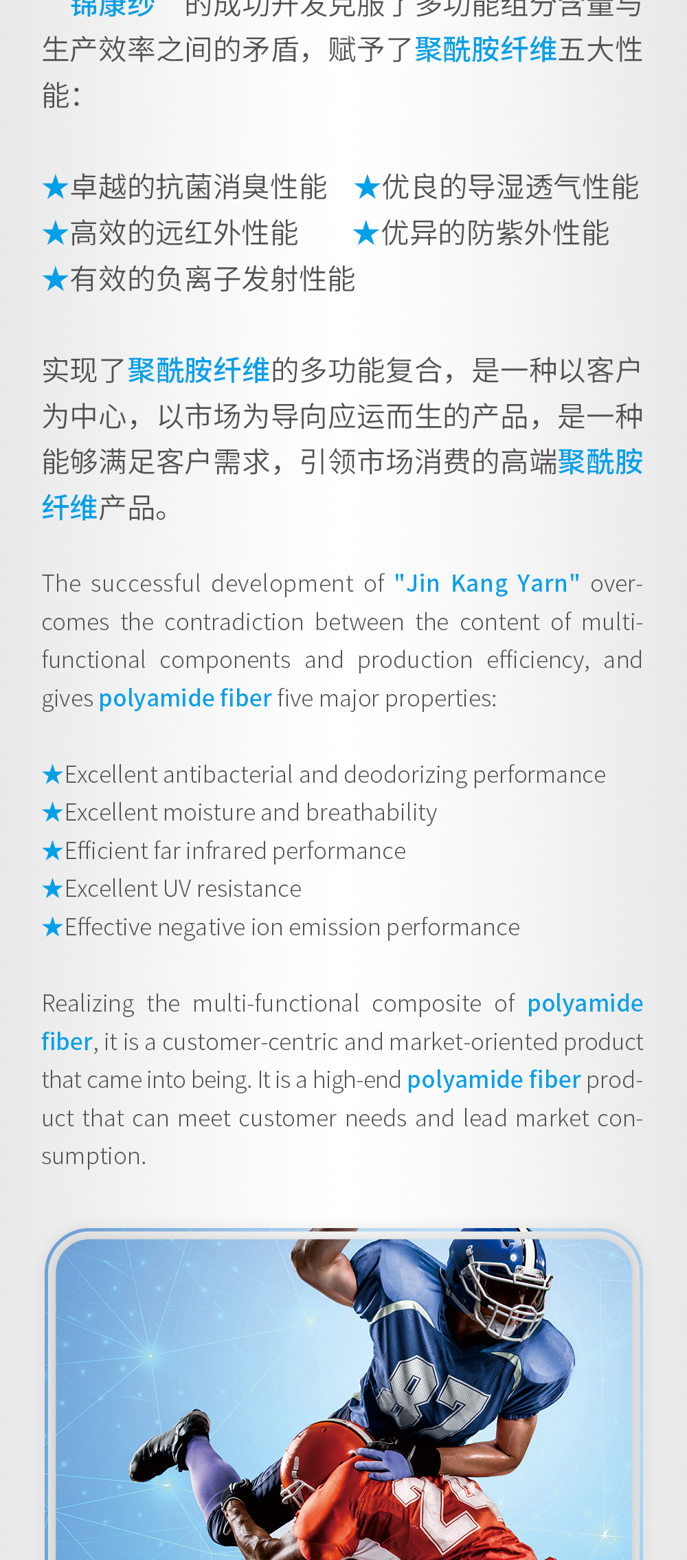“锦康纱”的成功开发克服了多功能组分含量与生产效率之间的矛盾,赋予了聚酰胺纤维卓越的抗菌消臭性能优良的导湿透气性能高效的远红外性能优异的防紫外性能以及有效的负离子发射性能,实现了聚酰胺纤维的多功能复合,是一种以客户为中心,以市场为导向应运而生的产品是一种能够满足客户需求引领市场消费的高端聚酷胺纤维产品。